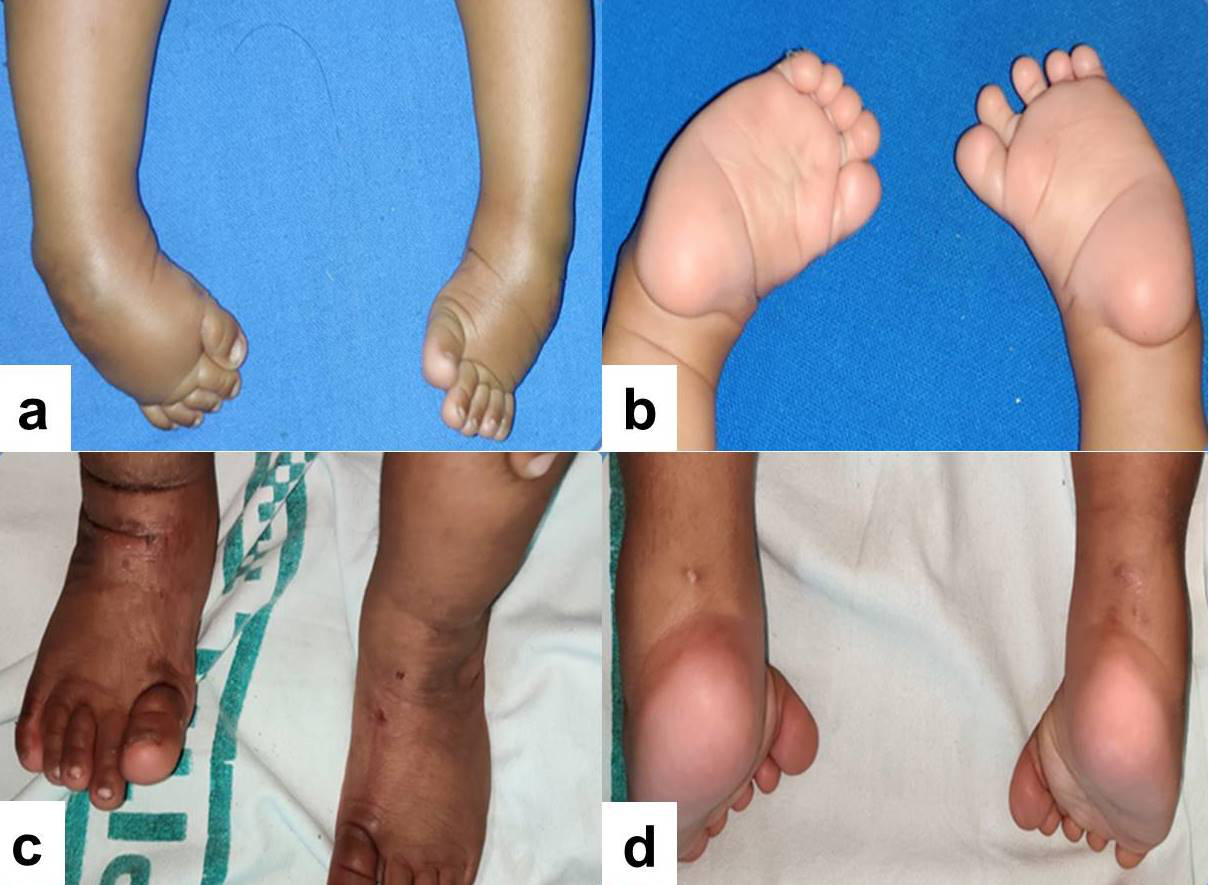 A functional, plantigrade foot is considered as an acceptable outcome in these children. Prior to the description of the modified Ponseti technique, operative as well as non-operative treatment strategies were employed for treatment of such feet with variable results. Turco in 1994 reported that the results with early soft tissue surgery were unpredictable and early surgical intervention usually results in a grotesquely deformed foot.9 Ponseti in their benchmark multicenter study in 2006 defined a modified protocol for the correction of these complex clubfeet and named it as Modified Ponseti technique.6 Since then, this technique has been the standard protocol in the management of Complex clubfeet.