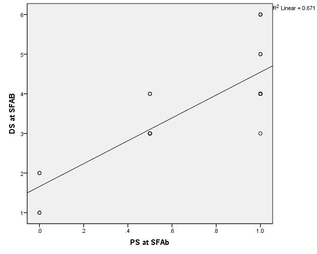 Figure 5 Shows significant positive correlation between Pirani Score at SFAB (post-treatment PS) and Dimeglio Score at SFAB (post-treatment DS).