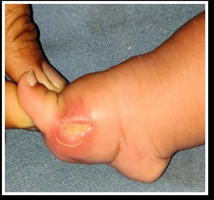 Pressure sore due to tight abduction brace with Paronychia |