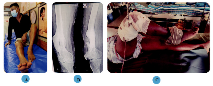 During our treatment, in one case cutting of patella by Kirschner’s wire and necrosis was observed of the skin around the knee, and pin tract infection were also recorded. We measured the ROM by our orthopaedic team. By using goniometer, we measured the range of movement. The stationary arm was placed from the greater trochanter to the lateral condyle, and the movable arm was placed from the head of the fibula and the lateral malleolus.