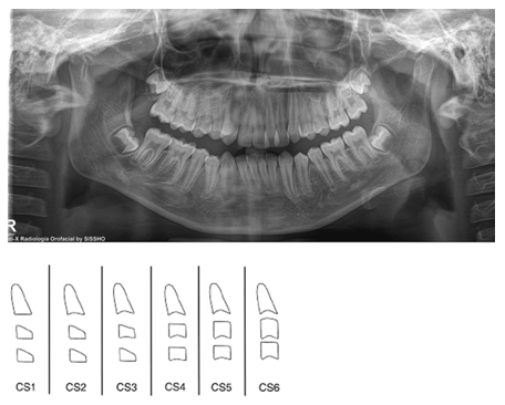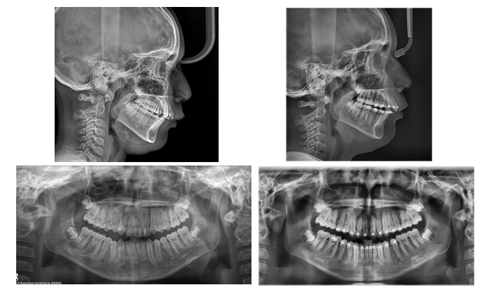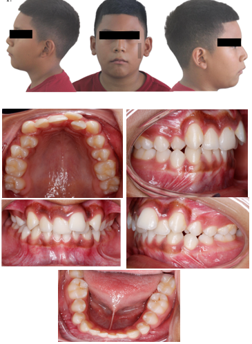 Male patient 11 years old with permanent dentition, skeletal class II, straight profile, compressed airway, cervical bone maturation stage CS2, presents compression of the upper arch and deep palate, mandibular retrogantism, with an upper model discrepancy -7.5mm, Bolton analysis shows anterior discrepancy of 5.4mm, the Pont analysis shows a transverse length deficit of -9.20mm, severe crowding in the upper jaw, moderate crowding in the lower jaw, facial biotype is mild Dolicofacial, in the periodontal examination aberrant lingual and labial frenulum was observed; the lower one limits the lingual movement. The indicated examinations included: intraoral photography, panoramic and lateral skull radiographs. When evaluating the results it was corroborated the existence of a transverse micrognathism of the maxilla (Figure 1).