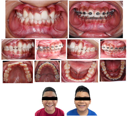 The treatment plan was discussed and it was decided to use the 9mm Hyrax type expansion screw, bands were made in the first molars, which were not cemented to be removed with an impression and to obtain a working model, in which this screw was adapted (Figure 2&3). The labial frenectomy was performed by the specialty of Periodontics using the classic rhomboidal technique, then on October 23rd, 2023 the cementation of the 9mm. hyrax type disjunctor was performed, applying two daily activations until the formation of the diastema (Figure 4). Applying two daily activations until the formation of the diastema (Figure 4). The appliance was activated ¼ turn in the morning and ¼ turn at night (0.5/day) for a total of 18 activations. Maxillary expansion was chosen instead of premolar extractions due to oral respiration. He is a patient with a restricted airway, therefore extractions would accentuate this condition; on the contrary, expanding the airway would be advantageous for his breathing, on the other hand, by providing the necessary space for the correct location of the tongue, it favors the stability of the upper arch.6 At all times, both the patient and the mother were told in detail how the hyrax-type circuit breaker works and that they could feel slight discomfort, as well as pain and tingling sensations. After 18 days, separation of the median suture was observed. Then, acrylic was added to the screw with the disjunctor to be used as a containment appliance for 3 months to allow time for the bone neoformation of the suture, while the 0.018 royh brackets were placed to align her teeth (Figure 5).