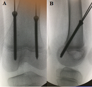 Using images in the coronal and sagittal planes with the fluoroscopy aid, two guide wires were inserted percutaneously (one for each incision), from proximal to distal and anterior to posterior, crossing the femoral distal physis with a 45 degrees angle at its posterior third, close to the subcortical limit of the medial and lateral femoral condyles. Two steel cannulated screws 4.5 mm thick were then inserted using two guide wires (Followmed®), with the screws tips fully located in the distal medial and lateral femoral condyles (Figures 1A & 1B). Then, suture of the subcutaneous tissue and the skin was performed.