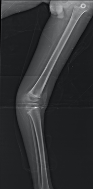 Figure 2B Panoramic profile X-ray of the left lower limb in profile, 25 months after surgical treatment for distal posterior epiphysiodesis of the femur with 2 cannulated 4.5 mm screws, showing correction of recurvatum knee deformity.