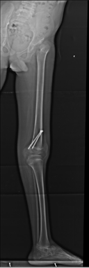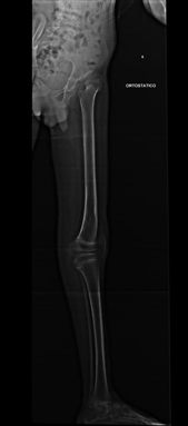 Figure 2A Panoramic radiograph of the left lower limb in profile, male patient, 9 years old, demonstrating recurvatum deformity knee of 32 degrees, due to cerebral palsy.