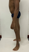 Figure 2D & 2E Pre- and post-operative clinical photographs of the left lower limbs in profile, showing correction of the recurvatum deformity by posterior epiphysiodesis of the distal femur in a patient with cerebral palsy.