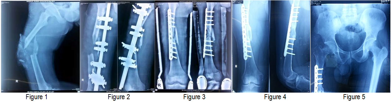 A 20-year aged male after a sustained Road Traffic Accident initially got admitted in Sylhet MAG Osmani Medical College Hospital, Sylhet with open fracture shaft of right femur. Radiographs demonstrated a fracture shaft of right femur type Gustilo IIIB with a segmental loss of bone. He was treated with upper-tibial skeletal traction and surgical toileting with debridement and was referred to National Institute of Traumatology and Orthopaedic Rehabilitation, Dhaka, where they fixed the femur with external fixator and surgical toileting with dressing several times.