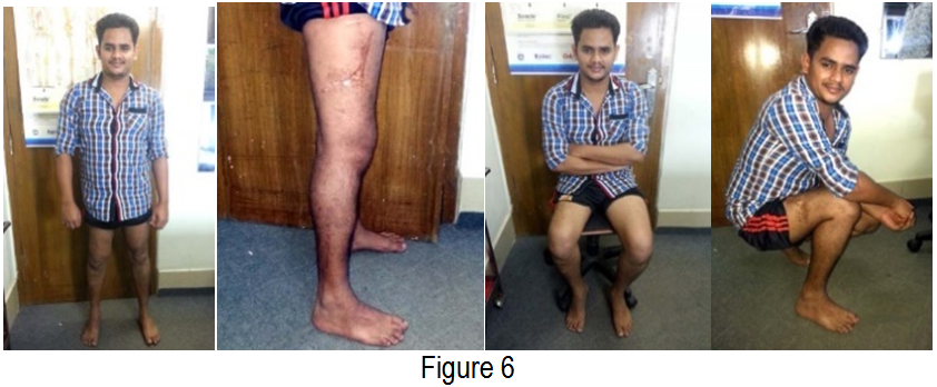 In the final follow up at 2 year, the patient was stable, right lower limb was painless extremity, and resumed active without using any protective device and absence of pain at the site of donor graft in the fibula (Figure 6).