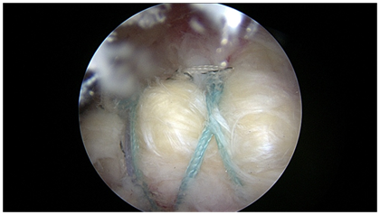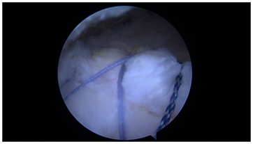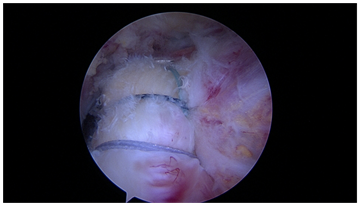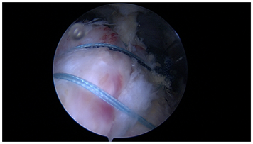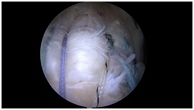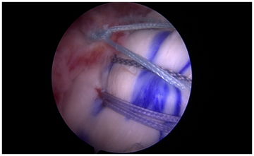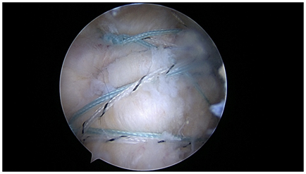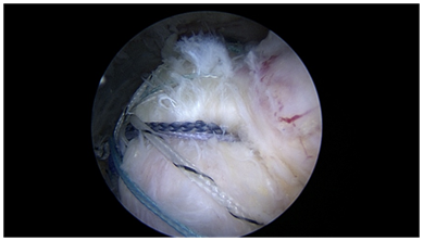 Figure 8 Biceps tenodesis: All transosseous suprapectoral biceps tenodesis with tendon grasping sutures.