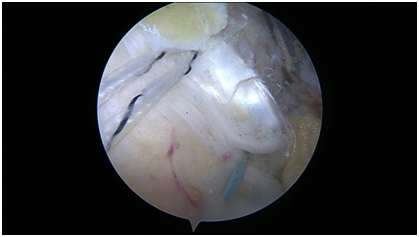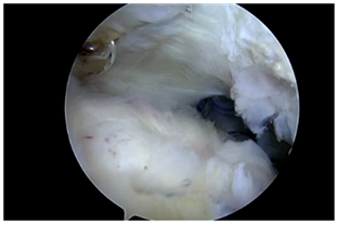 The biceps may be released, or initially left in situ for this technique. We prefer to release the biceps to allow for an interesting tendon grasping repair. Two tunnels are created with an awl from an anterolateral portal after releasing the biceps sheath. The first tunnel is created from the same portal in the inferior position, just at the superior margin of the pectorals major and above the anterior circumflex vessels. The doubled suture is retrieved through the tendon from an accessory inferomedial portal, and a locking loop is formed utilizing a retrograde passing device. This suture loop is then locked with the lateral suture tail and tied arthroscopcially with the biceps at physiological length from a posterior arthroscopic grasper. The second, more superior tunnel is then created using the arthroscopic tunneler. This double passing suture is then brought through the tendon using a retrograde passing device from the inferomedial portal. Grasping instruments are used to pass the loop over the tendon, creating a strong circumferential grasp on the tendon. The retrograde device is then used to create another locking loop through the circumferential loop, creating excellent fixation with a “cinch loop configuration”. These sutures are then tied arthroscopically with the post lateral. The remaining tendon is removed, and the tendon ends are annealed with the electrocautery.32-38