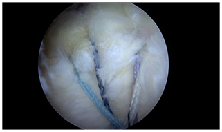Figure 7 Tunnel bounded, double anchor repair: one medial and one lateral anchor are utilized with two tunnels, creating six fixation points.