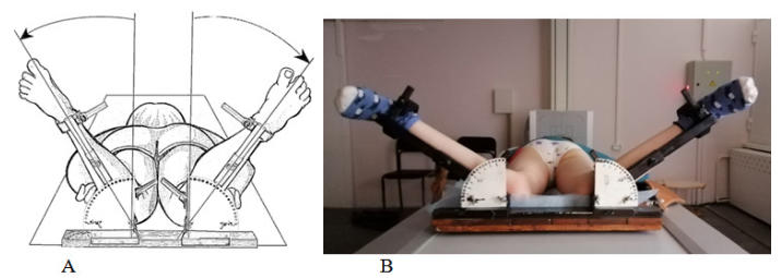 Formula: the method involves a combination of clinical and radiological methods and their interrelationship, which makes possible to obtain radiographic indicators that exist in different planes when performing only one X-ray imaging of the hip joints (anterior-posterior projection) of the patient in a prone position. In prone position patient’s knee joints are flexed at an angle 90º, both thighs are exposed to the internal rotation so that the neck of the femur is positioned parallel to the table (Figure 1B). To do this, the left hand of the doctor was used to palpate the greater trochanter, and with the right hand he performed the internal rotation of the thigh. At a certain point of rotation, the doctor with his left hand noted the maximum palpation of the greater trochanter, which indicates its most lateral position. Fixation of limbs with internal rotation of the thighs and measurement of femoral torsion were performed using developed by authors orthopedic console (patent for the invention №122629 and patent for utility model №140346) (Figure 3). Clinical evaluation of femoral torsion was recorded. The X-ray imaging of hip joints in the described above position was carried out so that we could establish true parameters of a hip joint.5