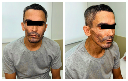Male patient, 40 years old, diagnosed at 31 years of age with SPR, presenting atrophy in the entire right hemiface, extending to the right parietal region and lagophthalmos. He used penicillamine 1 g/day for 6 months and methotrexate 20 mg/week for 5 years, in addition to aesthetic procedures, a few years after diagnosis. Undergoing ophthalmological follow-up using artificial tears. He began follow-up with a complaint of recurrent and disabling holocranial headache.4 Brain MRI showed enophthalmos on the right, atrophy of the subcutaneous tissue and of the masseteric and temporal muscles on the right, in addition to foci of signal alteration in the periventricular white matter of the right cerebral hemisphere. The headache was chronic, disabling and refractory to the continuous use, for more than 1 year, of amitriptyline 75 mg/day and valproic acid 2 g/day, either alone or in combination. The patient had a Headache-Related Disability Index (HDI-Brazil) score of 88 and a Headache Impact Test (HIT-6) score of 72, generating a significant negative impact on quality of life. Cannabis sativa promediol extract 200 mg/mL (CBD* + THC** combination) was prescribed at a dosage of 35 mg of CBD per day (7 drops every 8 hours), in combination with valproic acid 2 g/day and amitriptyline.5 After 3 months of continuous use of Cannabis sativa promediol extract associated with the anticonvulsant, both questionnaires HDI-Brazil and HIT-6 decreased to 56 points, with a significant improvement in the patient's quality of life. After 7 months of using the Cannabis extract, there was a decrease in the dose of valproic acid to 1.5 g/day, without compromising the improvement acquired (Figure 1-3).6,7