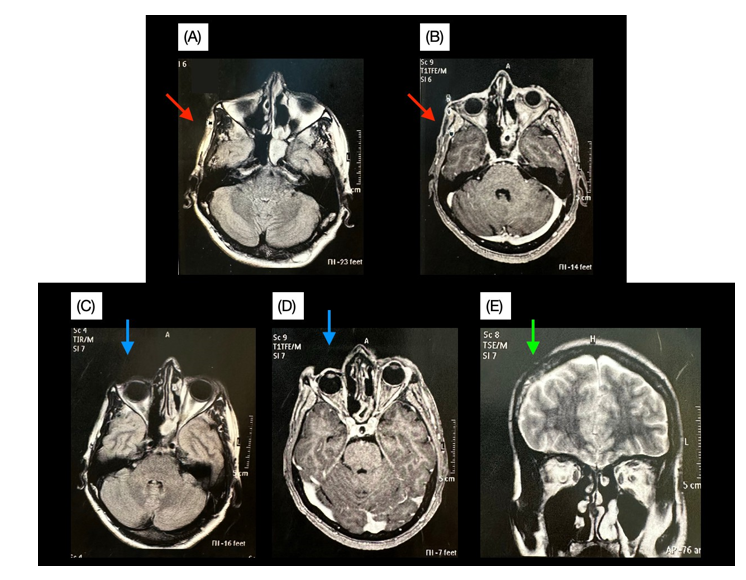 Figure 3 (A) and (C) T2-Flair MRI showing myocutaneous atrophy, involving masseter and temporal muscles (red arrow) and enophthalmos (blue arrow). (B) and (D) T1 MRI with contrast showing facial asymmetry (red arrow) and enophthalmos (blue arrow). (E) Represents coronal-T2 plane, showing cutaneous/subcutaneous atrophy (green arrow).