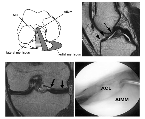Figure 5 Anomalous insertion of the medial meniscus (AIMM) anterior into the anterior cruciate ligament,(a) diagrammatic representation,(b,c) MRI showing anomalous insertion,(d) confirmed on arthroscopy.
