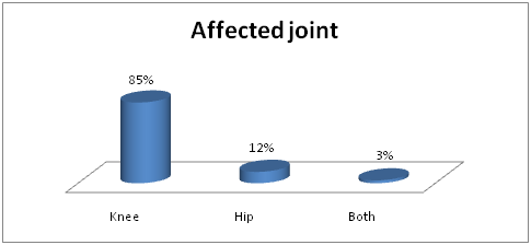 Knee was the most affected (85%) organ of osteoarthritis followed by hip (12%) and both knee & hip (3%).