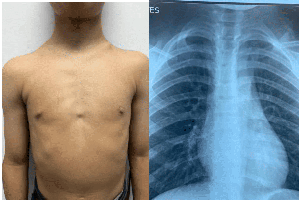 Figure 1 Frontal photograph depicting the triangular torso and posteroanterior (PA) chest radiograph showing a triangular shape of the thoracic cage and partial development of the clavicles.