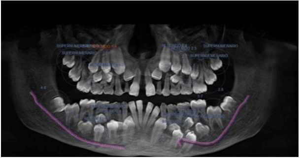 Following radiographic evaluation, the characteristic cleidocranial dysostosis triad—supernumerary teeth, total or partial clavicular agenesis, and cranial alterations—was evident (Figure 2 & 3).