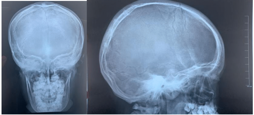 Radiographic studies including posteroanterior (PA) and lateral skull radiographs, PA chest radiograph, PA and lateral spine radiograph, and maxillary tomography were obtained (Figure 1).