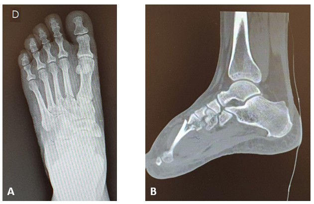 Figure 1 Radiograph (A) and computed tomography imaging (B) of the foot indicating fracture at the base of the 2º, 3º and 4º metatarsal. Source: Author’s personal arquive.