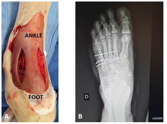 Figure 2 Clinical (A) and radiograph imaging (B) in the immediate postoperative of fasciotomy and osteosynthesis of the foot fractures. Source: Author’s personal arquive.
