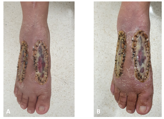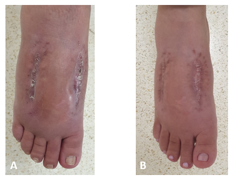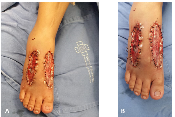 Figure 5 Foot’s healing process, right after the removal of the polypropylene prosthesis, with 10 (A) and 12 (B) weeks of postoperative. Source: Author’s personal arquive.