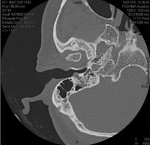 A 61-year-old woman was evaluated by otology for right peripheral facial paralysis with a six months evolution period, initially managed with steroids and Acyclovir without therapeutic response. Physical examination revealed facial motility House-Brackman VI/VI of the right side and I/VI of the left side, an erythematous lesion covered by skin in the right posterior inferior region of the external auditory canal (EAC), and bright tympanic membrane without fluid in the middle ear. In addition, the hearing tests showed a positive bilateral Rinne, and a Weber centered with tuning forks of 512 -256 Hz. Moreover, a simple CT scan of the ear showed attenuation and bony erosion of the stylomastoid foramen, mastoid portion of the facial nerve, and right EAC (Figure 1 & 2).