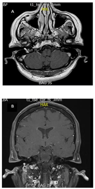 Figure 2 A-B. Axial slice of MRI T1- contrast sequence: Hyperintense lesion involving part of the right EAC. B. Coronal slice of contrasted MR T1 sequence: Hyperintense lesion involving the stylomastoid foramen and right facial nerve.