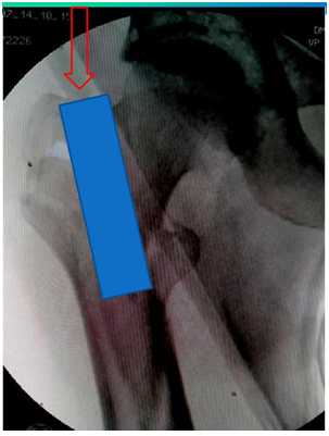 Figure 12 Entry point by femur finder, Cannulated awl. Curved awl can ensure entry medial to GT and reaming parallel to lateral cortex.