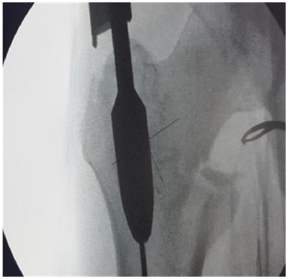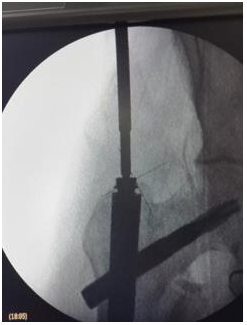 - Reamer to be pushed medially at entry point to break cortex so that reamer and nail is not displacing the fracture, as it leads to malposition of screws in head (Figure 18).