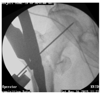 Figure 9 Entry by guide wire and special sleeve with multiple options at the trochanteric tip.