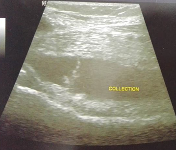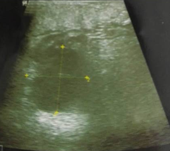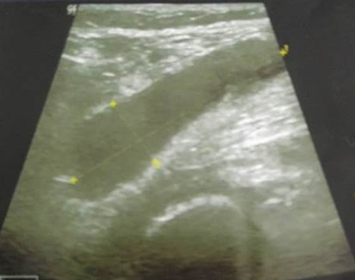 Doppler ultrasound showed no thrombophlebitis but objectified a right popliteal cyst ruptured in the calf (Figure 1 & 2) with a huge fluid collection into the right gastrocnemius muscle layers (Figure 3). The patient was treated with oral and topical nonsteroidal anti-inflammatory drugs for two weeks with favorable outcomes: progressive disappearance of pain and swelling of the calf with return to normal ten days after treatment. The two-week follow-up ultrasound showed complete resorption of the fluid collection in the calf.