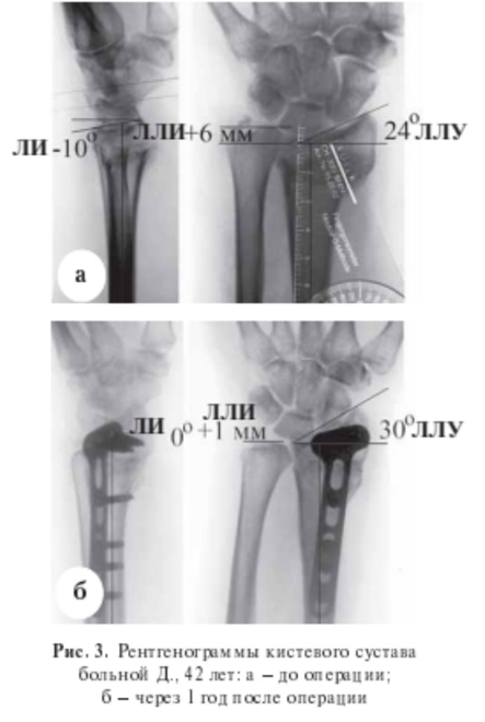 Figure 1 Radiographs of the wrist joint of patient D., 42 years old, a - before the operation; B - one year after the operation.17