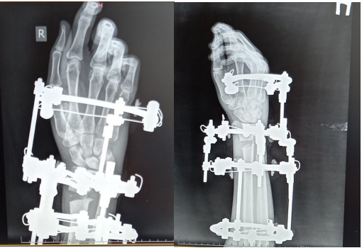 The existing progress in medical science allows us to revise the established views on the issue of DMLK treatment, suggesting the use of technically improved equipment, other methodological aspects at the preoperative stage of working with a patient, and much more. However, it should be noted that, despite all of the above, the use of external osteosynthesis, despite its popularity, does not solve the issues of minor post-traumatic deformity (1-2 mm), which causes osteoarthritis and arthritis of the affected segment, and also complicates the X-ray observation of DMLK and postpones the start of rehabilitation measures. Thus, the use of transosseous osteosynthesis according to Ilizarov has a number of immediate advantages (Figure 2 & 3).