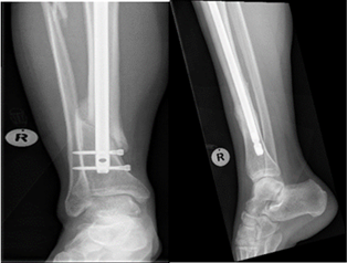 Advantages of intramedullary nailing include osteosynthesis under normal biological environment as the fracture haematoma is preserved, allows dynamic and load-shearing fracture stabilization without need to restrict joint movement, shorter operation time, better ankle mobilization, and lower rates of skin necrosis. Its major disadvantage is difficulty with controlling the distal fragment, hence the complication of malalignment.1–3