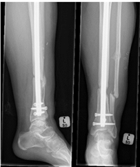 Our radiological findings in this study has not shown a significant role of supportive measures such as fibula fixation, number of locking screws used distally and use of blocking screws and assisting plates, to aid alignment and stability of the fractures post IMN. There were a few fibula fixations in patients treated with IMN and there was no use of blocking screws. Isik et al. also found no significant change in alignment when fibula fixation was done.19 In a prospective study done by Bhairi et al, they had good alignments in all patients done without fibular fixation, but still recommended fibula fixation when the fracture is close to the articular surface.13 Kougioumtzis et al demonstrated plate-assisted intramedullary nailing of distal non-communited tibia fractures with good results.20