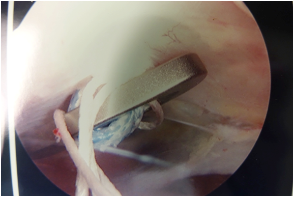 All patients underwent arthoscopic assisted AC joint reconstruction. Patients were placed in the beach-chair position. From the posterior portal, the base of the coracoid was visualized with a 70 degree arthroscope. A vector guide with a guidewire protection stop, inserted through an anterior portal, was placed at the base of the coracoid. A guidewire was inserted through both cortices of the clavicle and the coracoid under arthroscopic visualization. Great care was taken to make certain that the wire was centered anterior-posterior on the clavicle. The wire was placed approximately 2-4 cm medial to the AC joint. The wire was over-drilled with a 4.0 mm drill under arthroscopic visualization. The wire was protected with a curette to prevent advancement during over-drilling. A flexible suture passing wire was placed through the cannulation of the drill. The drill removed and the tightrope pulled into position. The coracoid button was flipped under arthroscopic visualization (Figure 1). The clavicle was reduced manually by a surgical assistant while the top button was fixed into position on the superior surface of the clavicle. It was secured with a minimum of 5 square knots.
