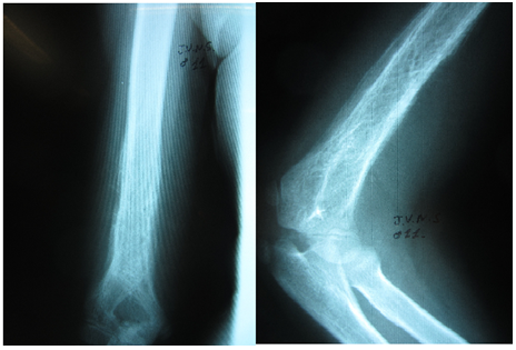 Figure 1 Anteroposterior X-ray view of the right humerus and lateral view of the right elbow. Permeable lytic lesion and “onion skin” periosteal reaction in distal humerus can be seen.