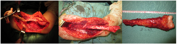 Figure 3 Bone defect after tumor resection on the left and reconstruction with vascularized fibula in the middle. The picture on the right shows the resected distal humerus.