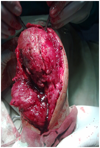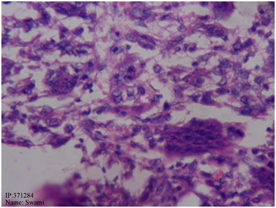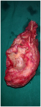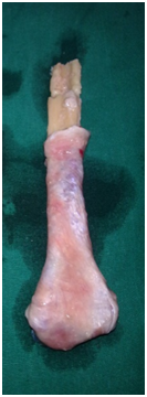 Under general anaesthesia tumour was exposed through posterior approach to elbow (Figure 3). Proximal ulna with tumour and 2cm of normal bone was excised (Figure 4). Another team of surgeons harvested required length of free fibular graft from upper fibula from ipsilateral leg. Head of the fibula was shaped to match the olecranon process of ulna and tensor fascia lata was covered over fibular head to act as articular surface (Figure 5). Graft was fixed to ulna using semi tubular plate and a K-wire was put for temporary immobilisation of elbow in 90degree flexion. Triceps tendon was sutured to the graft at proximal end. Specimen was sent for histopathological examination which confirmed the diagnosis of Osteoclastoma (Figure 6). Immediate post op X ray confirmed the proper fixation.