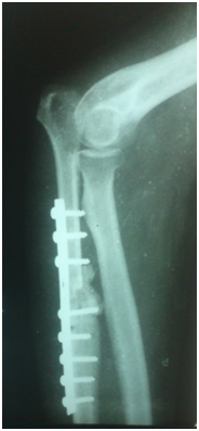 Giving a tumour free upper limb along with a functional elbow joint was a challenging part. Hence treatment plan included en-bloc excision of proximal ulna with tumour and safe margin of normal appearing bone and to reconstruct the elbow joint using free fibular graft.