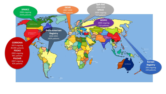 The major SpA based registries are listed below (by alphabetical order), with a description of the methodology and the population included and a brief report of findings. Most of the data that we have today come from Europe and the Americas. Figure 1 presents the major SpA registries by geographic distribution, dates and number of patients.