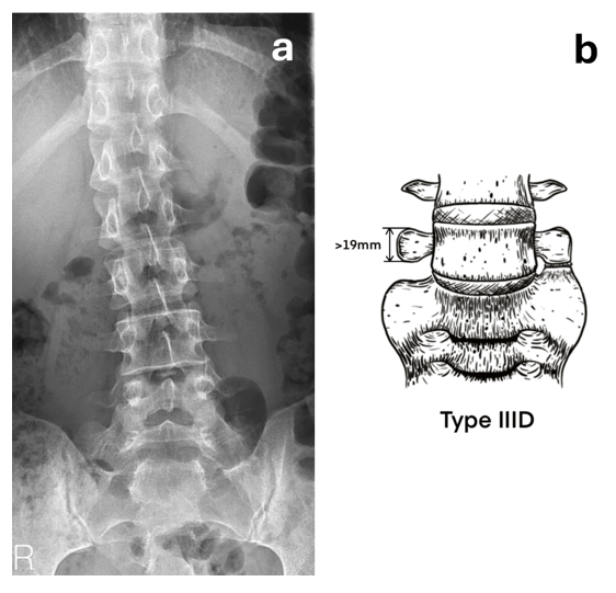 Figure 1 (a) X-ray film of lumbar spine showing scoliosis and a transitional vertebra in the lumbosacral junction. (b) Compatible with our classification Type IIID, which show transverse process that measures 19 mm or more in height with a pseudo-joint on the opposite side.