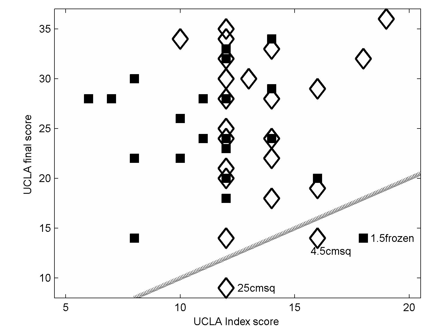 Figure 1 Comparison of UCLA final scores and UCLA index score for each patient. Filled symbols correspond to repairs of RC tears <=3cm2 and diamond symbols indicate results for RC tears >3 cm2. The solid line indicates final UCLA score = index UCLA score, i.e. no change in the UCLA score after repair. Tear sizes for the three cases that lie below the no-change line are listed by each symbol.