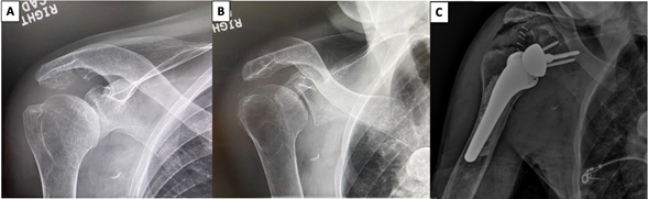 Figure 1 (A) Preoperative anteroposterior, (B) preoperative Grashey, and (C) postoperative anteroposterior radiographs.