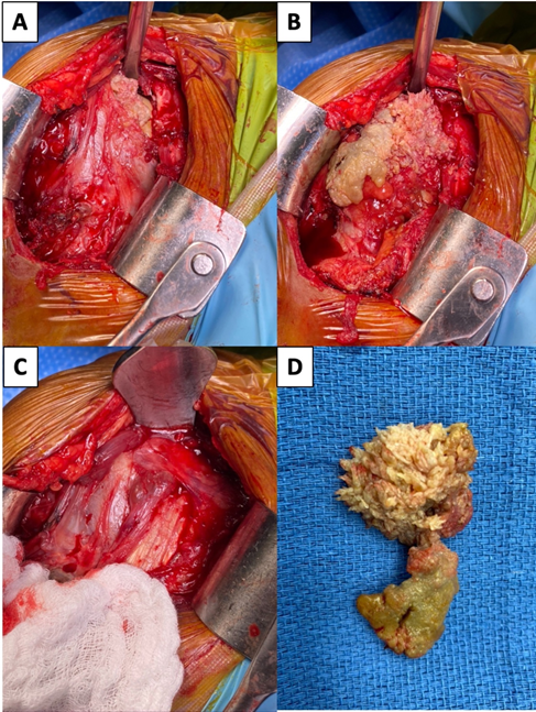 Figure 2 Intraoperative view of the pathology during (A) exposure, (B) prior to resection, (C) after resection, and (D) the specimen removed from the body.