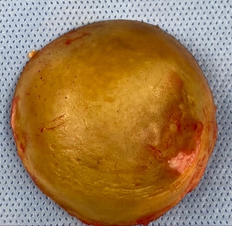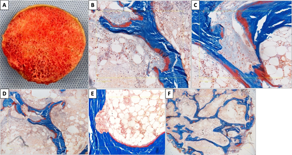 The patient underwent a reverse total shoulder arthroplasty (RTSA) based on his rotator cuff pathology and debilitating symptoms in 2020. A preoperative radiograph of the shoulder is portrayed in Figure 1A and B with appreciation of pathologic subacromial changes with the ultimate treatment of a RTSA depicted in Figure 1C. Intraoperative inspection revealed a large soft tissue mass, measuring 6.5 x 3.2 x 2.0 centimeters, in the area of the supraspinatus footprint (Figure 2A-2D). Additionally, abnormal appearances of the humeral head (Figure 3), soft tissues, glenoid rim, and labrum were observed. Histological specimens of intra-articular soft tissue, labrum, and synovium were obtained and confirmed the diagnosis of amyloidosis (apple-green birefringence by Congo Red Staining) and showed focal calcium pyrophosphate deposition (Figure 4A & 4B). Additionally, histology specimens of the undecalcified bone tissue showed moderate secondary hyper-parathyroid bone disease with peri-trabecular amyloid deposits (Figure 5A-5F).