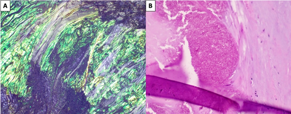 Figure 4 (A) Amyloid stained by congo red under polarized light displaying apple-green birefringence and (B) calcium-pyrophosphate crystals in soft tissue.