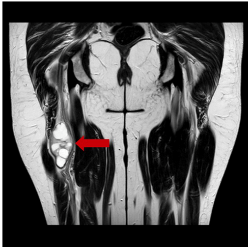 Figure 1 MR of the lower extremities without contrast, coronal cut: ovoid lesion of heterogeneous structure and dependent areas of one of the fascicles of the sciatic nerve (arrow).