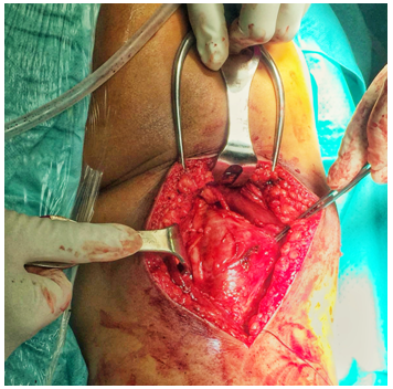 Figure 2 Intraoperative image: nodular tumor with whitish coloration, adjacent to the sciatic nerve in its most cranial portion of the right thigh.